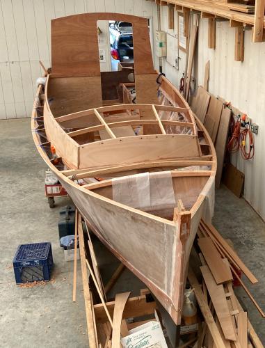 So, with the air temp in the 40-45 degrees F range, there was lots of open time on the epoxy. Didn't need to recruit a large crew. I prepped the mating surfaces, wiped them down, then applied GelMagic to the keel (lightly coated) and the keel land on the hull (heavily coated). Bill was in the shop so he donned gloves and helped me move the keel into position. Temporary fasteners were used to attach the keel at the stem, then I was able to go under the boat to fasten the keel along the keelson line. The result was a keel that was glued and screwed into position, ready to clean up on the outside. ![]() Only two permanent fasteners were in the boat at this point: one 3/8" X 3 1/2" lag screw at the bow and another 3/8" X 3" near the end of the keel. In between, the keel was tied mechanically to the hull with 2 1/2" X 9 temporary screws. Three oil filled radiant heaters were positioned under the boat to get the epoxy up to temperature for curing. ![]() Everything looked good on the outside. The keel will be shaped to blend into the stem once the epoxy has cured. A couple of days later, the temporary screws were removed and #14 X 3 1/2" bronze screws driven in the mid section, with 3/8" bronze lag screws driven into the keel forward and aft. ![]() The keel of this boat is over 20' long. At this point, the shaping needs to be done forward and aft, then the joint between keel and hull will get a finished fillet to ease the transition for fiberglass cloth which will be applied over the keel and onto the hull for bonding. We will do that next after some filleting and filling of screw holes. Many thanks to Bill for his help! |