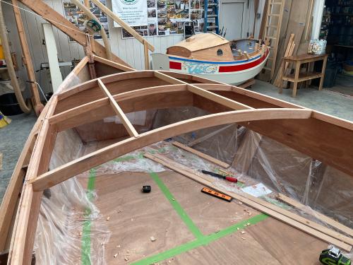 Only two things on the list prior to rolling the boat over: The UHMW protective shoe for the keel and constructing the rolling frame. My nephew, Nate is in the plastics business, so he's sourcing the UHMW for me which is much appreciated. The rolling frame started with a big pile of construction lumber. ![]() The material was delivered to the shop on the roof racks of the trusty Subaru. Over the course of two days 2x6's were fastened to five of the temporary frames; then uprights were fitted to protect the topsides. These are beveled to fit the angle of the hull and padded with trailer bunk carpeting. The "tops" of these are roughly parallel to the keel both along and in elevation to make the roll-over as drama-free as possible. ![]() Fitted to the tops of these uprights are 2x4 pads that will support the rolling weight of the boat on the port side chine log. These are padded with bunk carpet. The 2x4x10' on the floor will be fastened to the rolling edge along the chine. A 2x6x12' will tie the 2x6 supports and all of the temporary frames together. All the big stuff is screwed together with 1/4" GRK screws. The connections of the 2x6's nearest lifting points are reinforced with steel 90 degree plates. I didn't get a photo of these installed, but it will be included in the next post. It was good to get all of this done prior to a short trip out of town. Next time we'll be installing the UHMW keel shoe and making final preparations to the rolling frame for the roll over. |