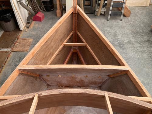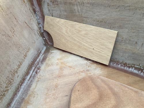 The deck is filleted into the sides to allow fiberglassing. The interior sides will get an additional layer of 6 oz glass in addition to the 10 oz interior hull layer, while the deck will be covered by one 6 oz and one ten oz layer of glass set into epoxy.