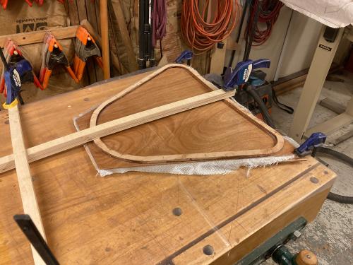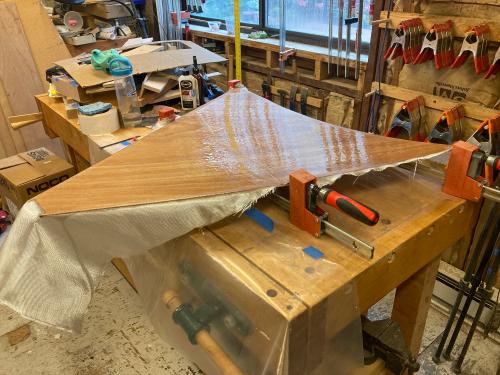 The deck is made of two pieces of 6mm Okume, they are glued together and then the bottom surface was fiberglassed. The top surface will be fiberglassed with the rest of the anchor deck after installation. The panel is clamped to preserve some pre-arc.
